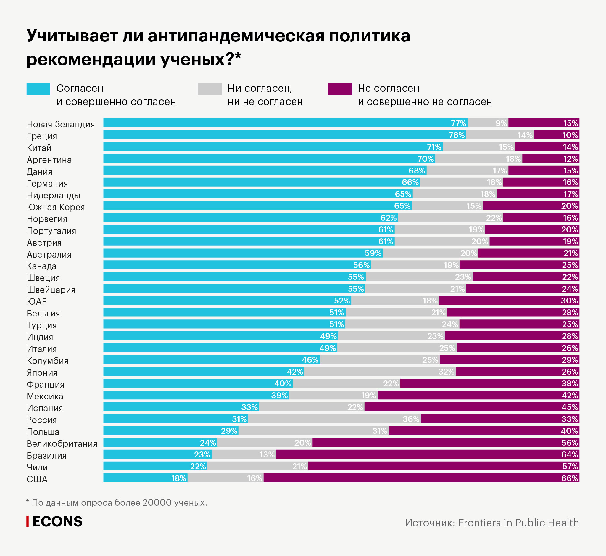 • В том, что власти страны используют научный подход в борьбе с пандемией и смягчении ее последствий, сильнее всех уверены исследователи из Новой Зеландии. За последнюю неделю в стране регистрируется 3–6 новых случаев заболевания COVID-19 в день против более 80 на пике пандемии в конце марта — начале апреля. Премьер-министр Новой Зеландии Джасинда Ардерн стала самым популярным главой правительства в истории страны и одержала убедительную победу в выборах, состоявшихся в октябре 2020 года, набрав максимальное число голосов за всю историю выборов последних пяти десятков лет.