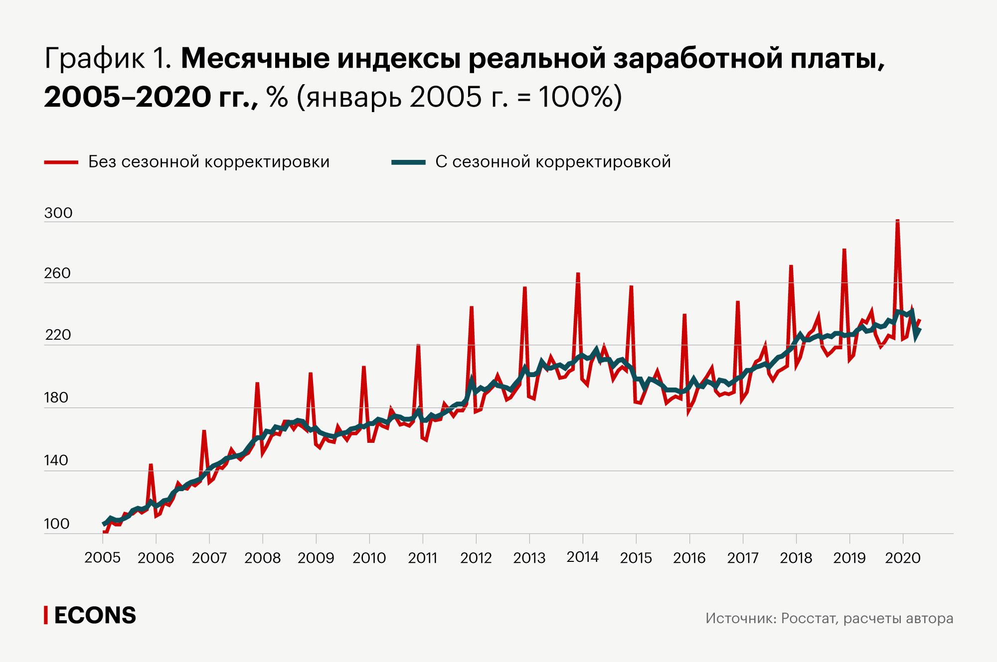 К этому нужно добавить, что оплата труда в российских условиях всегда отличалась высокой гибкостью в сторону понижения. В качестве примера достаточно сослаться хотя бы на апрель 2020 г., когда, по нашим расчетам, реальная заработная плата упала на 6,3% (с очисткой от влияния сезонных факторов, но с учетом влияния нерегулярных, таких как локдаун) – фактически на столько же, на сколько она «просела» за весь период кризиса 2008–2009 гг. (график 1). С учетом роста индекса потребительских цен в этом месяце на 0,8% это означает, что на старте кризиса российские предприятия урезали номинальную заработную плату более чем на 5%.
