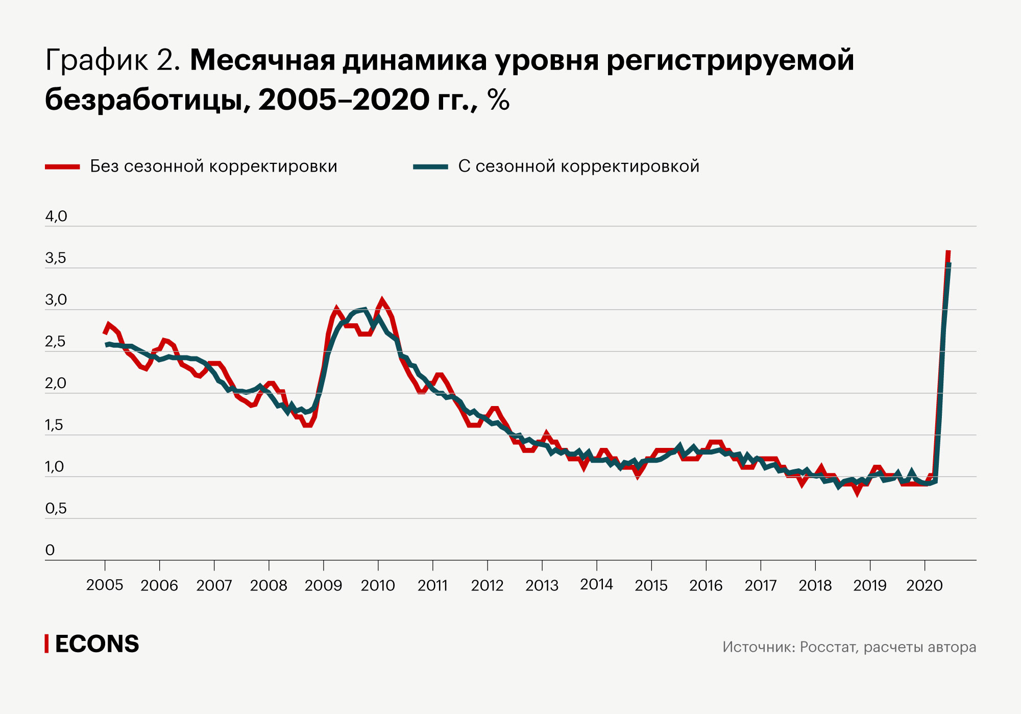 В этих условиях выдвигаются предложения восполнить возникший пробел в данных с помощью альтернативного индикатора – уровня регистрируемой безработицы. Во втором квартале 2020 г. он продемонстрировал фантастический рост – почти в четыре раза, с 1% в марте до 3,7% в июне. Такого резкого скачка регистрируемой безработицы российский рынок не знал за всю свою историю. Для сравнения: на пике кризиса 2008–2009 гг. уровень регистрируемой безработицы вырос «только» в 1,8 раза (график 2).