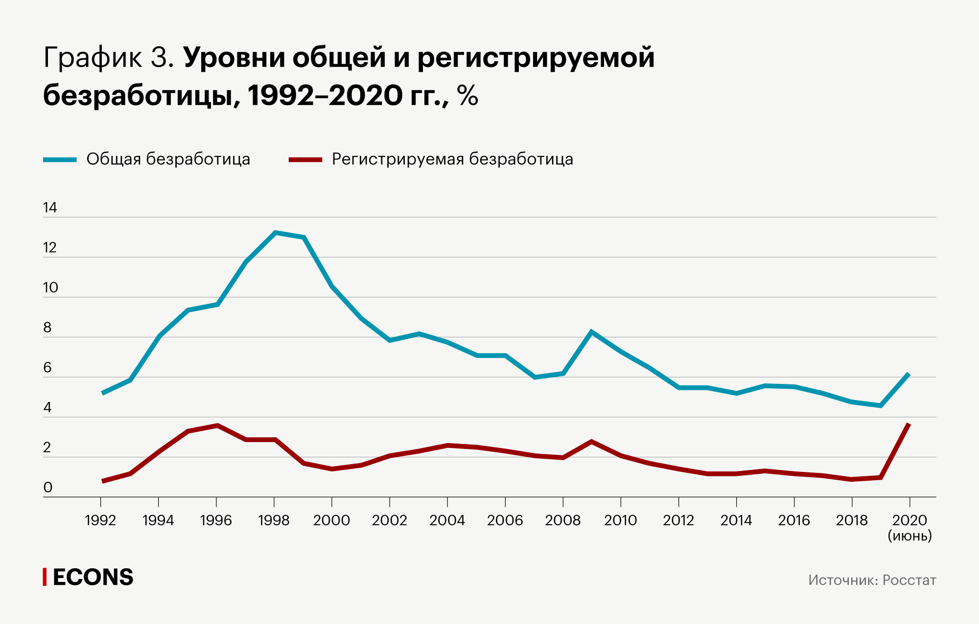 Уровни общей и регистрируемой безработицы – это два разных показателя, которые рассчитываются по разным алгоритмам и значения которых могут сильно отличаться. Очевидно, например, что чем ниже размер пособий по безработице, тем слабее у соискателей стимулы к тому, чтобы вставать на учет в службах занятости. В международной статистической практике более точными и методологически более корректными однозначно признаются показатели общей безработицы (по методологии МОТ), и именно о них шла речь выше.