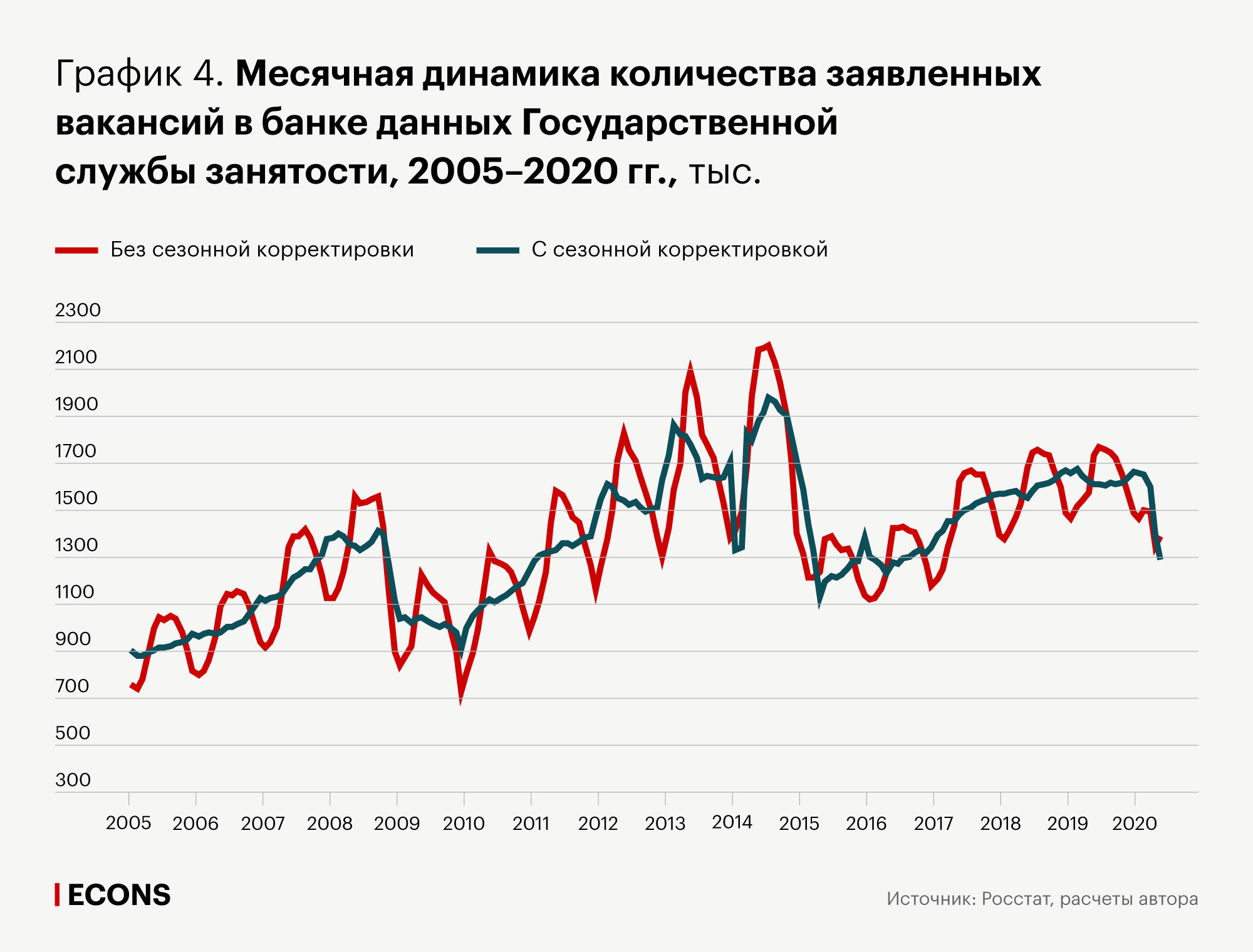 Ограничимся двумя примерами. Первый – динамика количества вакансий в банке данных ГСЗ. За апрель – май 2020 г. оно уменьшилось на 10%, что сопоставимо с регулярными сезонными колебаниями этого показателя (график 4). Такое более чем скромное снижение плохо корреспондирует с взрывным ростом регистрируемой безработицы. Для сравнения: на пике кризиса 2008–2009 гг. количество вакансий в банке данных ГСЗ просело на 40%! Но информационная ценность этого показателя явно выше, чем показателя регистрируемой безработицы: в то время как система регистрации и поддержки безработных в коронакризис была радикально перестроена, система учета вакансий осталась прежней и, как следствие, была свободна от отклонений, которые внесли в статистику регистрируемой безработицы недавние законодательные инициативы.