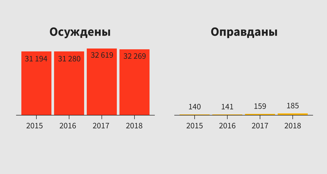 • Ни одного приговора по крупным уголовным делам на бизнес с 2018 года еще не было, но статистика не оставляет бизнесменам почти никаких шансов. Средняя доля оправдательных приговоров по предпринимательским статьям — 0,47%, шанс на оправдание по главной статье 159 (мошенничество) — 0,44%.