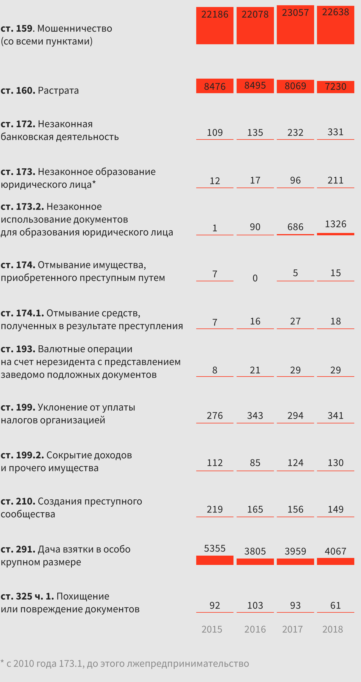 Судебная статистика подтверждает их опасения. Несмотря на ежегодные слова Владимира Путина о том, что «бизнес не должен ходить под статьей», число приговоров по экономическим статьям медленно, но растет. В 2015 году по самым популярным экономическим статьям (мошенничество и легализация преступных доходов, растрата, лжепредпринимательство, уклонение от уплаты налогов, отмывание имущества) были осуждены 31 194 человека, в 2018-м — 32 269. Доля оправдательных приговоров по этим статьям — не больше 0,5%.