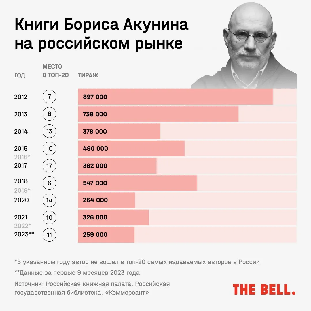 За последние 11 лет Борис Акунин неоднократно входил в топ-20 самых издаваемых авторов в России, а его книги издавались тиражами в сотни тысяч экземпляров. Суммарный тираж его книг за все время — 30 млн экземпляров (данные АСТ). Для сравнения: всего за 2022 год АСТ выпустило 9650 наименований книг, чей общий тираж составил 43 млн экземпляров, следует из статистики Российской государственной библиотеки.