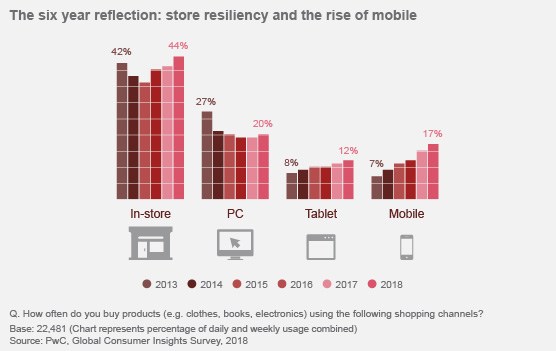 • Соцопросы подтверждают, что инвестиции в офлайн-магазины оправданы. Согласно опросам PwC, количество людей, которые ходят в магазин как минимум раз в неделю, выросло за последние три года — с 40% в 2015 году до 44% в нынешнем. А рынок электронной коммерции, по данным PwC, по-прежнему занимает менее 15% в B2C-отрасли.