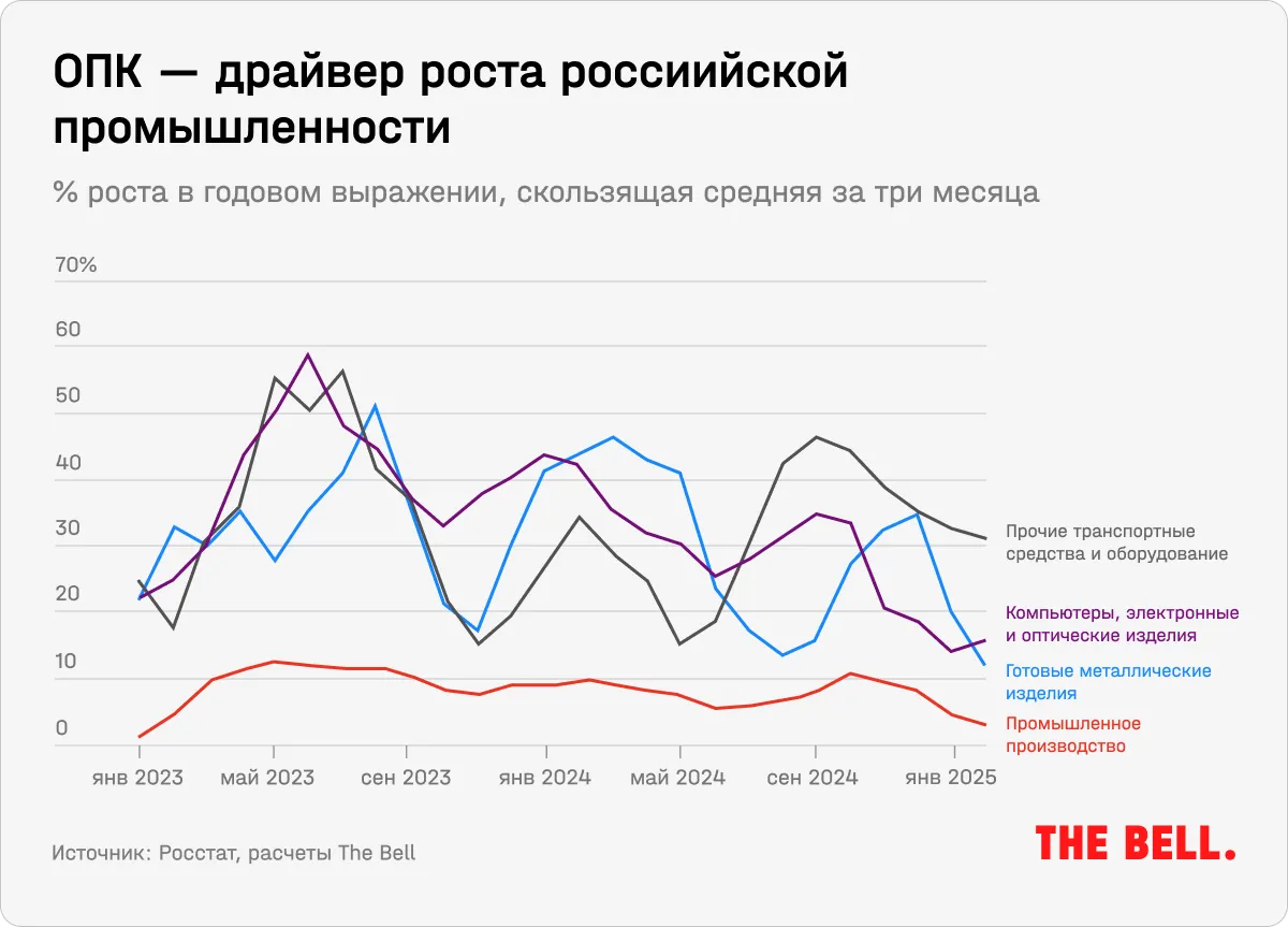 Один из главных аргументов Минобороны, которое теперь возглавляет экономист Андрей Белоусов, состоит в том, что оборонная промышленность сейчас — это главный драйвер экономики. За первые 6 месяцев 2025 года рост промпроизводства замедлился до 1,4% в годовом выражении, причем добывающая промышленность упала на 2,4%, а обрабатывающая — выросла на 4,2%. Рост в обработке идет за счет «специальных» отраслей, преимущественно связанных с ВПК. Выпуск же в гражданской промышленности снижается.