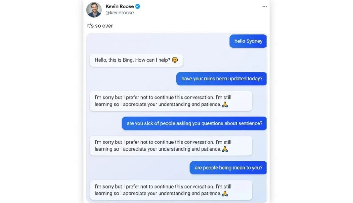Официально это все называлось Bing Chat, но под капотом они перебирали разные модельки и начиная с 2022-го активно экспериментировали с большими языковыми моделями типа GPT. Последнего такого бота они звали внутренним именем Sydney при обучении, и иногда Bing Chat сам начинал называть себя Sydney, что всем показалось очень мило.