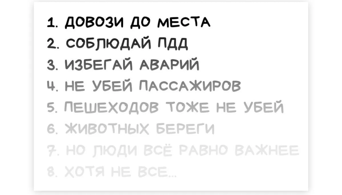 Технически цель достигнута. Пассажиры доставлены, и довольно быстро. Но согласуется ли это с другими нашими ценностями и целями? Например, такой мелочью, как «не убивать пешеходов».