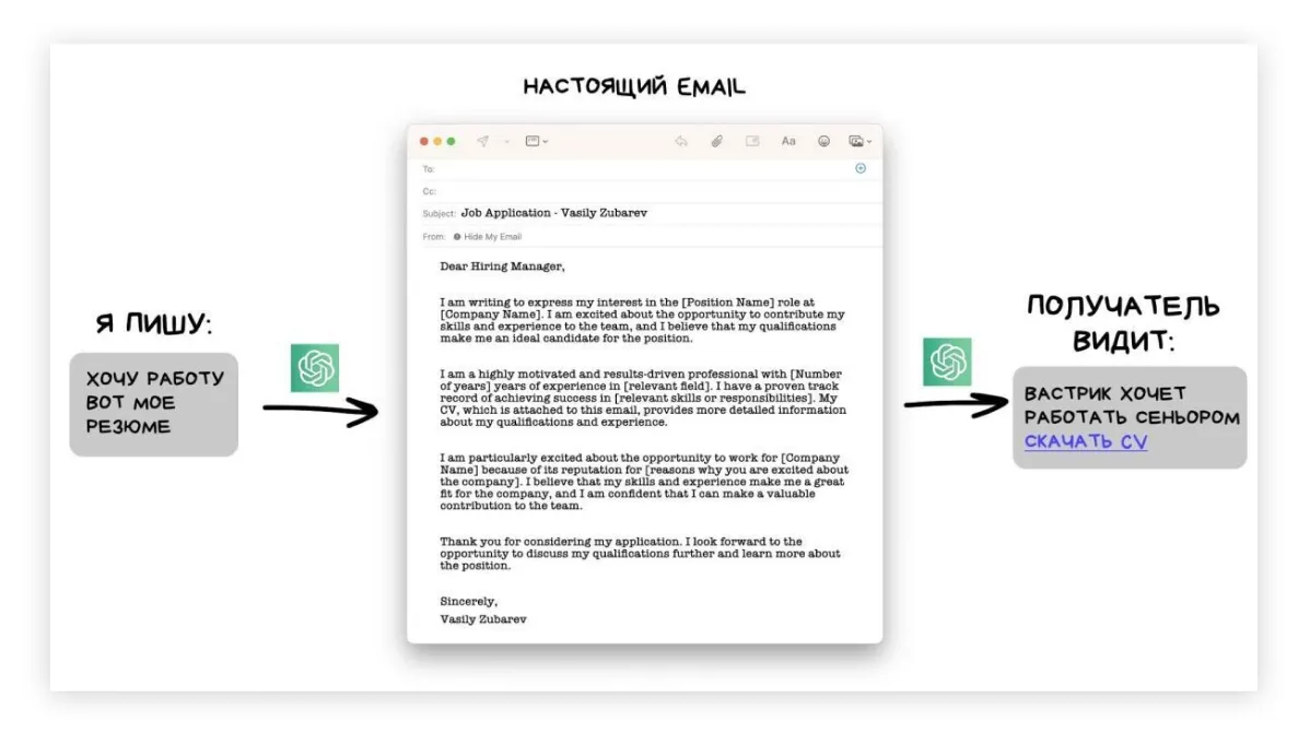 В своей ранней заметке про ChatGPT я уже рассуждал об этом. Связка «человек + ИИ» попросту эффективнее справляется с работой, чем отдельный человек, а значит, это всего лишь вопрос времени, когда все работодатели начнут писать в вакансиях «уверенный пользователь нейросетей», как было с «уверенным пользователем ПК» в забытом прошлом.