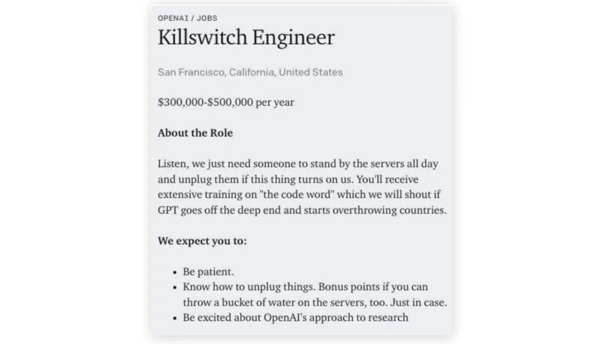 OpenAI даже полуиронично запостил вакансию Killswitch Engineer, чтобы было кому дернуть рубильник, «если эта штука выйдет из-под контроля и начнет свергать страны».