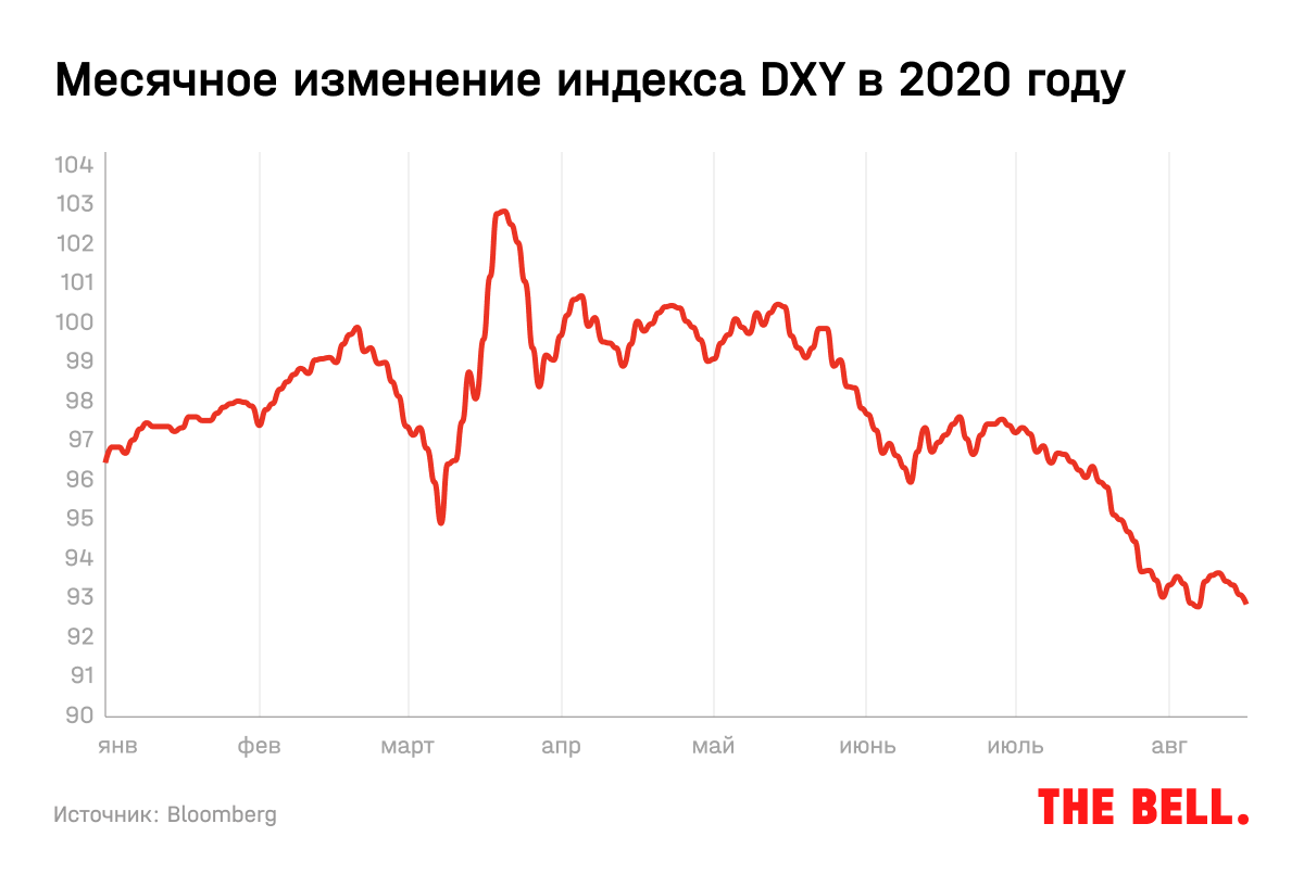 В июле этого года индекс DXY, отражающий динамику американской валюты против шести других основных валют, потерял 4,2%. К середине октября доллар не восстановился. С момента объявления о первом пакете помощи экономики США в конце марта индекс упал на 5,4%. Всего с начала года — на 3%, даже несмотря на краткосрочное ралли в марте-апреле, когда инвесторы бежали в доллар на новостях о пандемии.