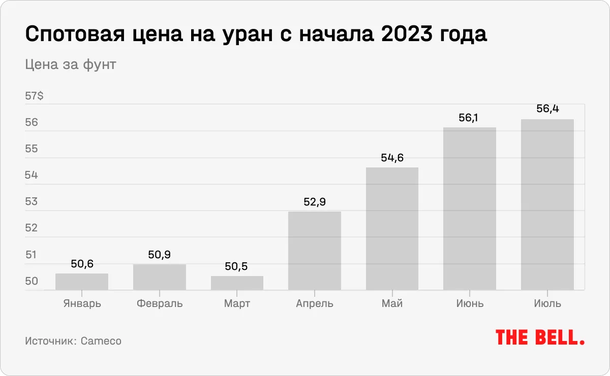 По данным канадского уранового производителя Cameco, спотовые цены на уран выросли на 18,2% с начала года по конец июля. Вслед за ними вверх устремились акции компаний, связанных с ураном: бумаги Cameco взлетели на 49%, а паи фонда Sprott Physical Uranium Trust, владеющего физическим ураном, прибавили более 13%. Это идет вразрез с динамикой цен на другие сырьевые товары, связанные с энергетикой: нефть подорожала всего на 8%, газ подешевел примерно на 30%, а медь торгуется на тех же уровнях, что и в начале года. Подробнее о ситуации на рынке меди мы рассказывали в прошлом выпуске рассылки.