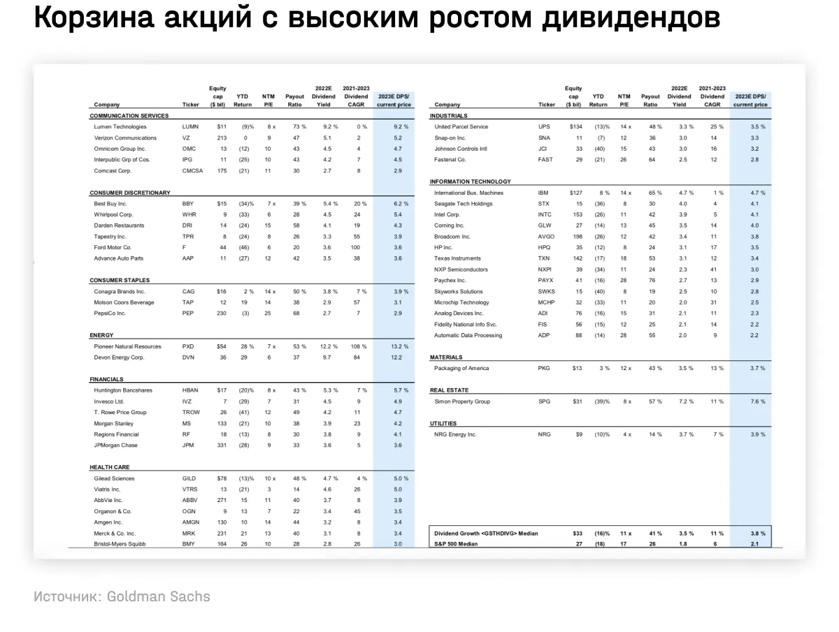 3. Дивиденды будут привлекательными, даже если произойдет рецессия. В медианной по глубине рецессии с 1945 года дивиденды падали только на 1%, при этом рынки ожидают более существенного снижения дивидендов. Также аналитики отдают предпочтение акциям с высокой дивидендной доходностью и устойчивым ростом дивидендов. Медианная компания из подборки ниже торгуется с дивидендной доходностью в два раза выше средней (3,8% против 2,1%), в два раза более быстрым ростом дивидендов (11% против 6%) и по более низким P/E, чем медианная акция из S&P 500.