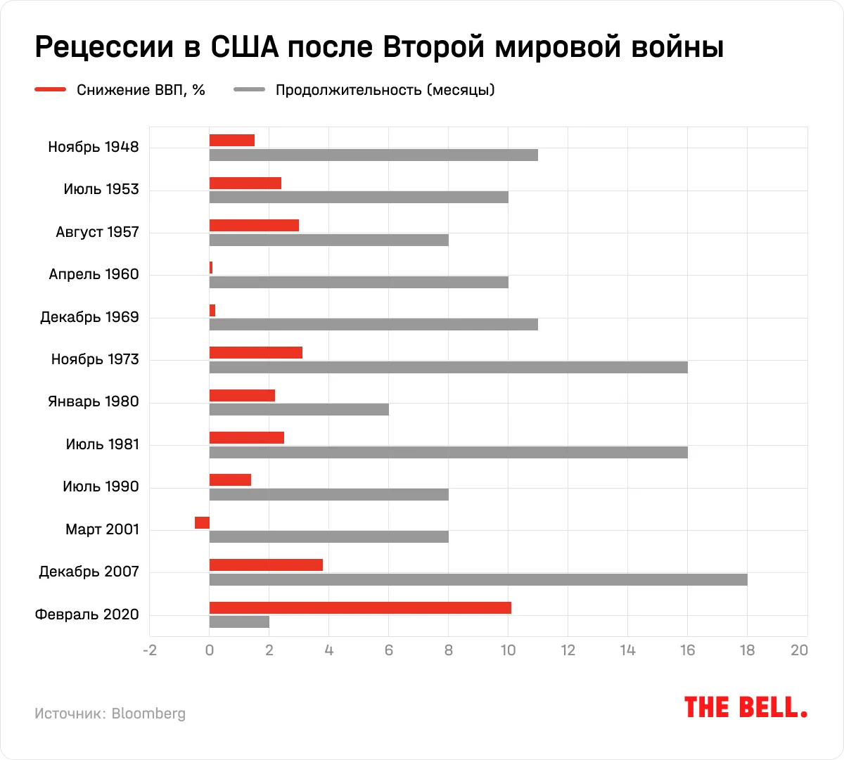 Начиная со Второй мировой войны во время рецессии экономика в среднем падала на 2,5%, безработица росла на 3,8 п. п., а прибыли компаний падали на 15%. Средняя продолжительность рецессии составляла 10 месяцев.