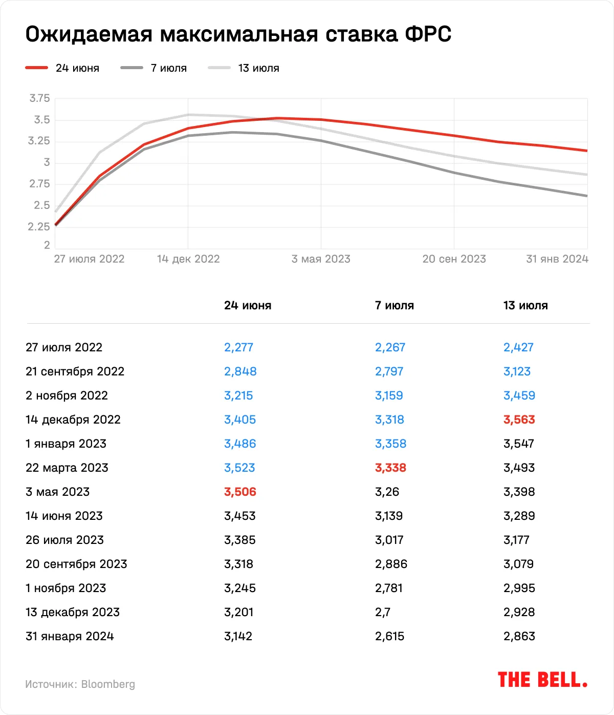 Это уже привело к тому, что в июне инвесторы уменьшили свои ожидания по росту ставок ФРС. Рынки считают, что регулятору придется реагировать на замедление экономики, как это уже было в феврале, когда началась война в Украине. 24 июня консенсус-прогноз рынков, согласно Bloomberg World Interest Rate Probabilities, состоял в том, что максимальная ставка в этом цикле подъема составит 3,523 и будет достигнута в марте 2023 года, а к концу 2024 года составит 3,142. Но с тех пор инвесторы снизили ожидания, а 13 июля, после выхода данных об инфляции, рынки поверили в гораздо более быстрый подъем ставки (до максимума в декабре 2022-го в 3,563) и гораздо более резкое снижение.