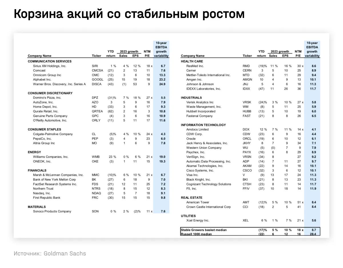1. Компании со стабильным ростом прибыли. При замедлении экономического роста и ужесточении финансовых условий акции «качественных компаний» исторически превосходят рынок. Вот на какие акции обращают внимание в инвестбанке (с начала года доходность корзины этих акций опередила доходность индекса S&P 500 на 4 п. п.).