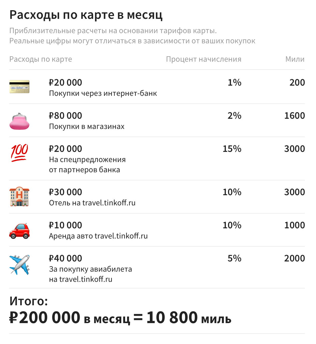 Еще одно ключевое отличие ALL Airlines Black Edition от стандартных бонусных программ авиакомпаний – возможности копить мили за любые покупки по карте. За оплату авиабилетов, отелей и прокат авто банк начисляет больше миль. Максимально за месяц можно заработать 30 000 миль. Мы подсчитали, сколько можно получить за месяц стандартного использования карты. Допустим, это именно тот месяц, когда ее гипотетический владелец решил отправиться в отпуск.