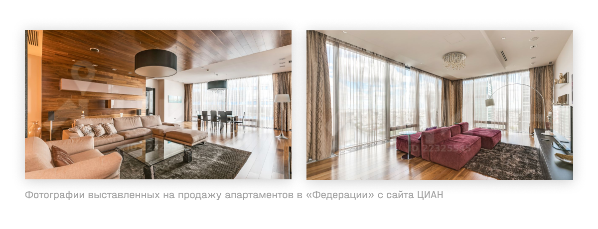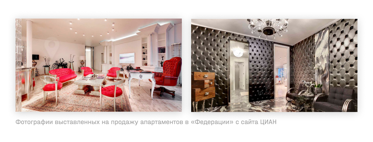 • В 2017–2018 гг. в собственность бывшего министра сельского хозяйства Елены Скрынник (2009–2012 гг., до этого — глава «Росагролизинга»), по данным Росреестра, были оформлены три помещения в «Федерации»: 352 кв. м, 309 кв. м и 212 кв. м. Помещения выглядят своеобразно, утверждает собеседник The Bell, бывавший внутри: ремонт сделан в стиле салона с кожаными стегаными стенами, необычными стульями, а стену украшает двухметровая фотография Скрынник с Владимиром Путиным. По словам собеседника The Bell, недавно апартаменты были выставлены на продажу. Из доступных на сайте ЦИАН фотографий апартаментов схожего размера, на продажу выставлены апартаменты за 606 млн рублей. Скрынник отказалась от комментариев.