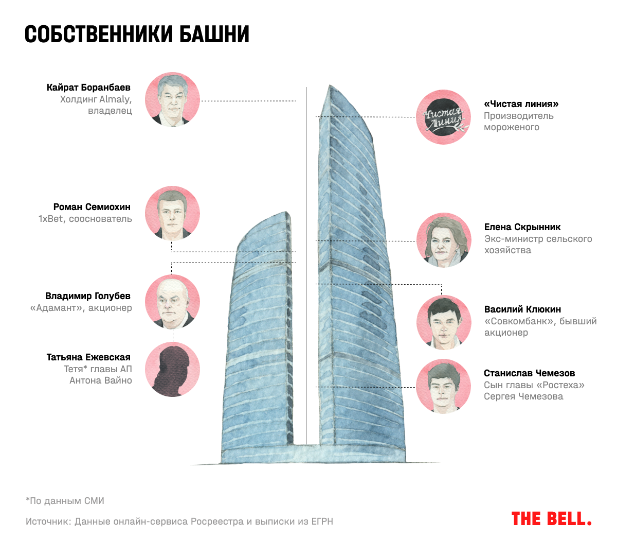 Единственный небожитель, который не стал прятать себя в реестре, — казахский бизнесмен Кайрат Боранбаев. Как писал казахстанский Forbes, дочь Боранбаева замужем за внуком бывшего президента Казахстана Нурсултана Назарбаева. Боранбаеву принадлежат нефтехимические, газовые, девелоперские активы, отели в Казахстане, а также фармацевтический бизнес, где его партнером выступает владелец российского «Фармстандарта» Виктор Харитонин. В «Федерации» Боранбаеву через фирму «А-Актив» принадлежат апартаменты площадью 482 кв. м. Он купил их в феврале 2019 года у застройщика. Боранбаев не ответил на вопросы The Bell, переданные через его представителя.