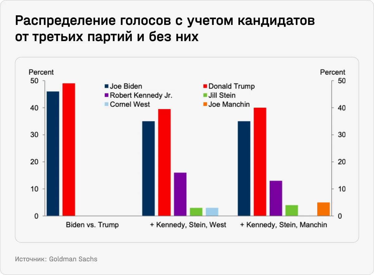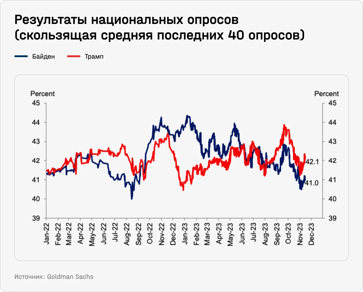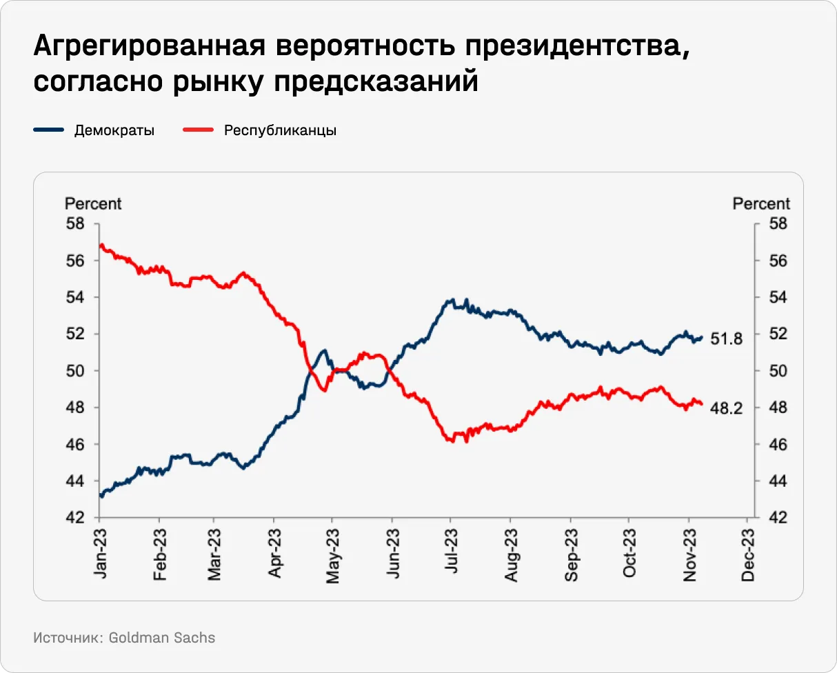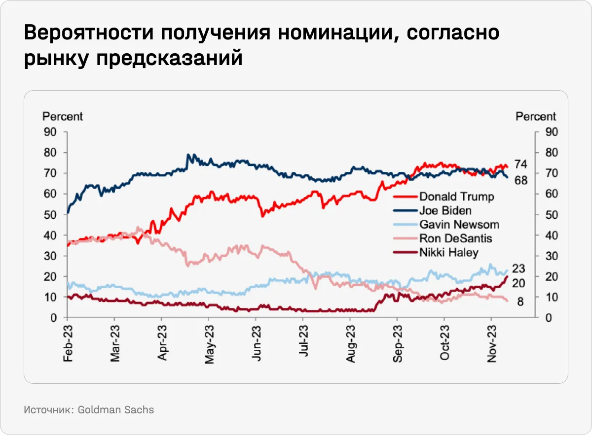При этом пока что кандидаты от обеих партий не определены: впереди и праймериз, и голосования по кандидатам. По данным сайта RealClearPolitics, агрегирующем предсказания по различным политическим событиям, на который не стесняются ссылаться и в GS, в отношении кандидата от демократов неопределенность больше, чем обычно, от республиканцев — меньше. И Байден, и Трамп пока явно лидируют среди других кандидатов, хотя еще в начале года шансы Рона Десантиса оценивались выше, чем у Трампа.