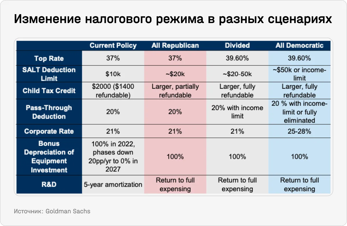 1. С учетом двух факторов выше давление на Байдена — в случае его победы — относительно продления некоторых мер по сокращению налогов, истекающих в 2026-м, будет усиливаться, отмечают в GS. Скорее всего, большая часть мер по сокращению налогов не будет продлена, и добавятся некоторые новые налоги. В случае контроля демократов над Сенатом могут быть подняты налоги на доходы корпораций, что, естественно, негативно для прибылей. Правда, шансы на это невелики.