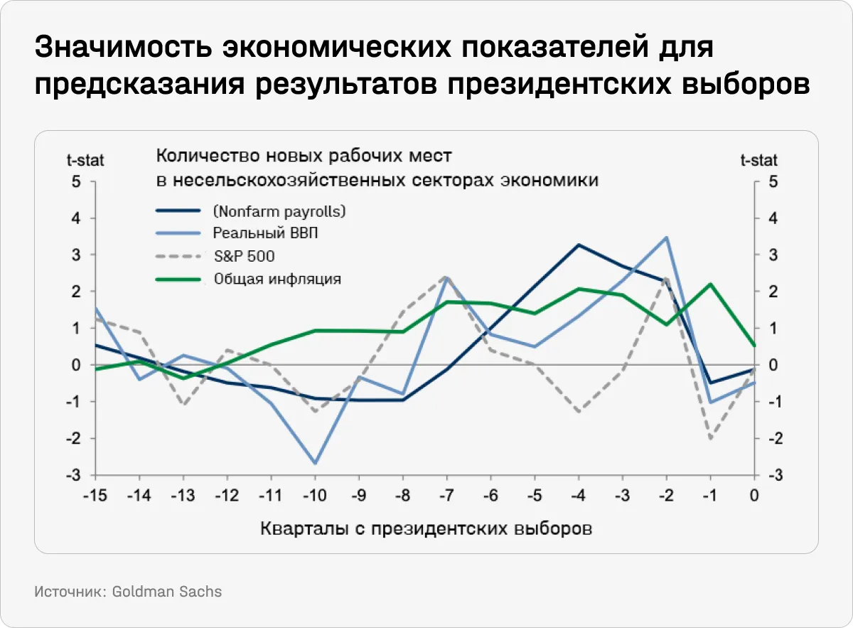 Многие из самых больших ошибок были связаны с экономическими событиями, которые происходили за год до выборов и ближе к выборам. Кандидаты, которые переизбирались на второй срок, обычно выигрывали, если в экономике не было рецессии. По оценке GS, вероятность рецессии сейчас, как и в обычное время, составляет 15%, что меньше консенсуса (почти 50%, по данным на начало октября).