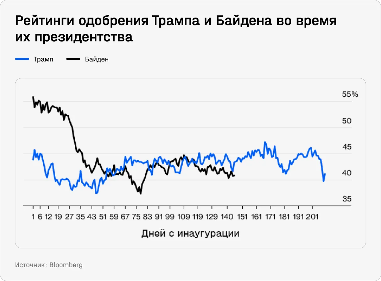 Результаты опроса NYT привлекли много внимания, соглашаются аналитики по экономике США в Goldman Sachs (GS), отчет которых есть у The Bell, но опросы по отдельным штатам, проводившиеся в разное время, сигнализируют о преимуществе Трампа уже несколько месяцев. Кроме того, как отмечает Отерс, рейтинг одобрения Байдена лишь немногим хуже, чем аналогичный показатель Трампа за столько же времени до выборов.