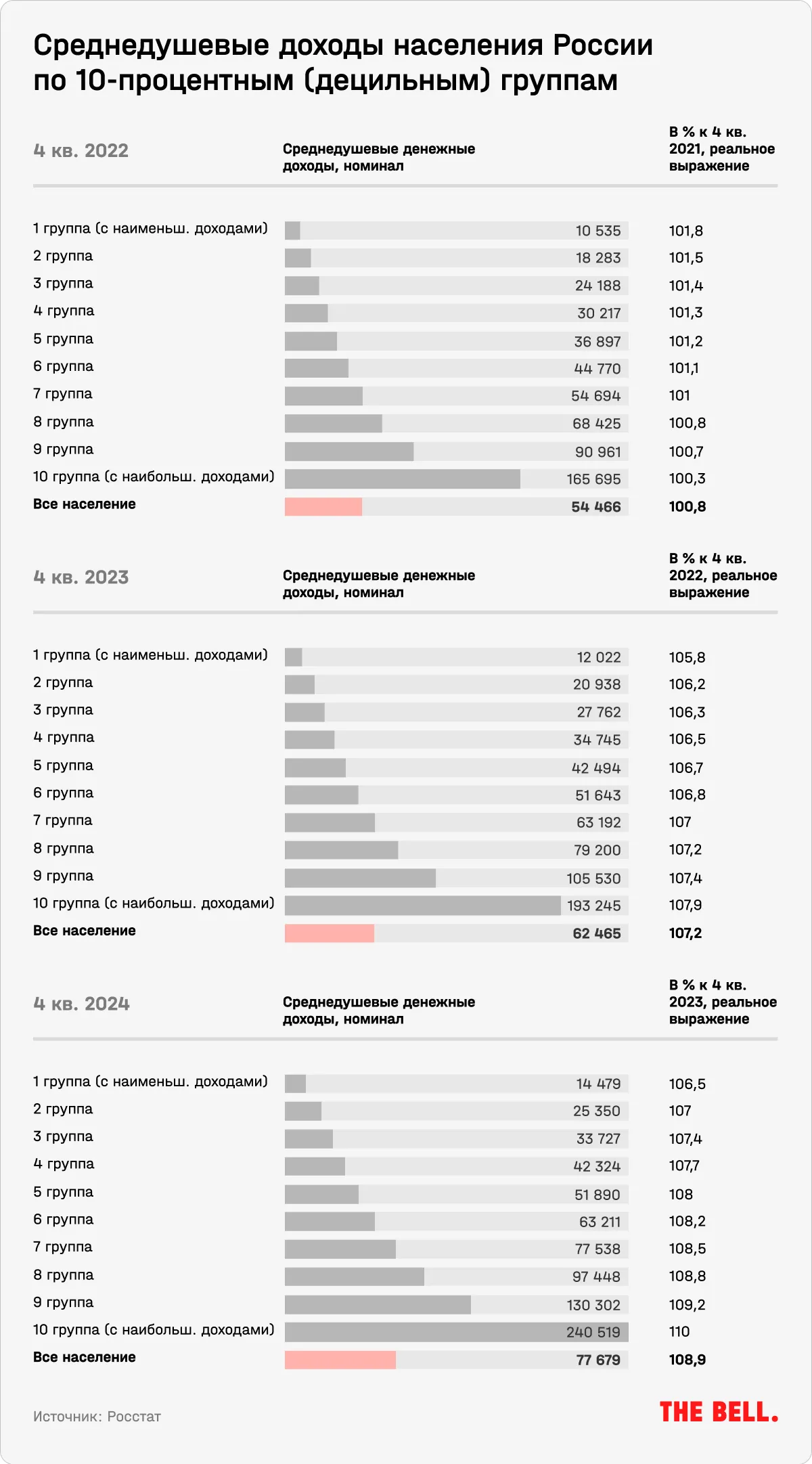 Наименьший рост — 6,5% — наблюдается у группы с самыми низкими доходами (1-я группа). Максимальный — 10% — у наиболее обеспеченной группы (10-я). Связано это и с выплатами, которые перевели вчерашних бедных в категорию среднего класса, и с ростом зарплат у квалифицированных рабочих и инженеров, и с инфляцией: у богатых есть дополнительный доход от высоких процентов по сбережениям. Но в основе этих процессов — война, которая стала важным перераспределителем денег в экономике, но не уравнителем. Богатые по-прежнему богатеют, а бедные беднеют.