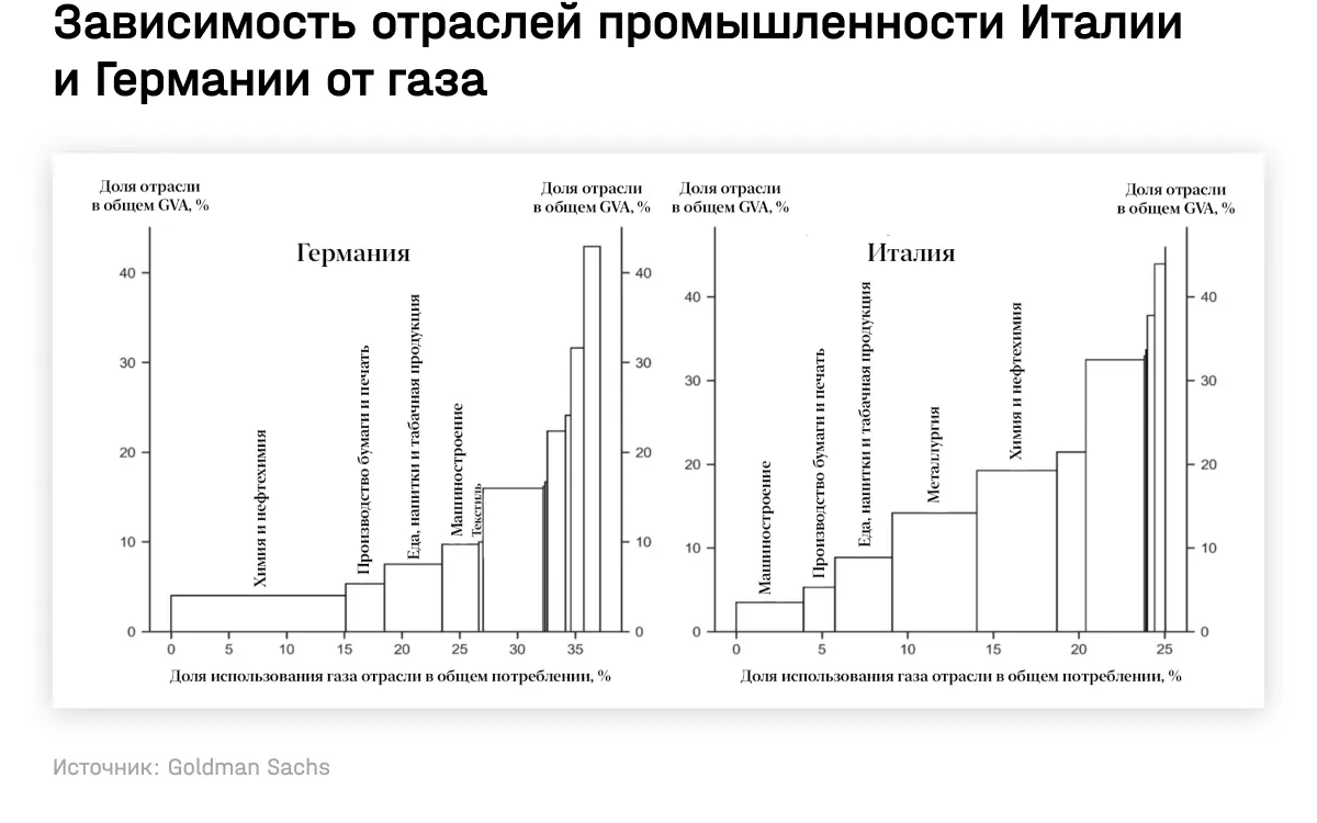 По расчетам GS, при полном отключении поставок дефицит газа в Германии в годовом выражении составит 20 млрд куб. м, что составляет 65% всех потребностей промышленности, в Италии — 12 млрд куб. м (85% потребления в промышленности).
