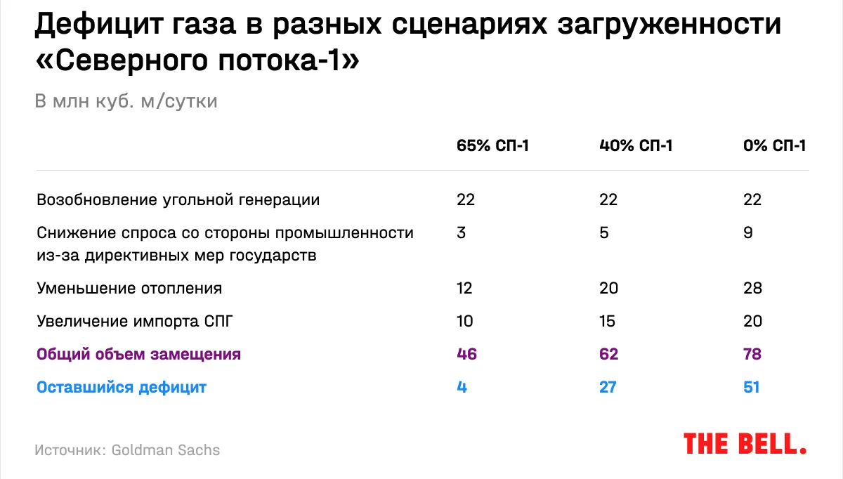 По расчетам GS, если план не будет принят, а поставки по «Северному потоку — 1» сохранятся на уровне текущих 40%, дефицит газа составит 14 млрд куб. м до конца марта. Это приведет к тому, что Европе придется ограничивать потребление в промышленности.