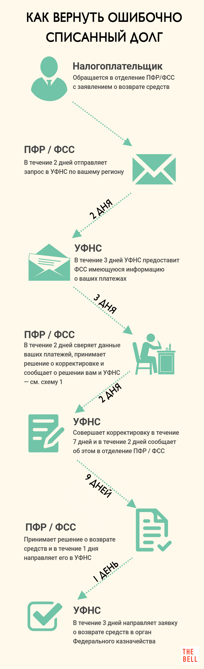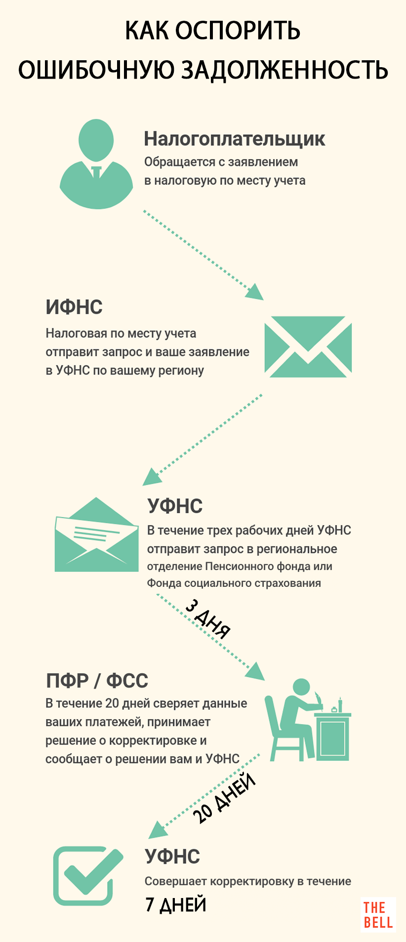 Одна из наших собеседниц, предпринимательница Ольга из Москвы, рассказывает, что попыталась довести дело до конца, но у нее ничего не вышло. Для начала она написала два обращения о несуществующем долге: в ПФР и ФНС. ПФР подтвердила, что долга за ней нет, а ФНС уведомила, что он составляет 300 тысяч рублей. С начала разбирательств прошло уже больше месяца, но ПФР так и не уведомил налоговиков об ошибке. За это время по решению налоговой со счета предпринимательницы уже попытались списать 300 тыс. рублей, но так как сумма на нем была меньше, его заморозили целиком.