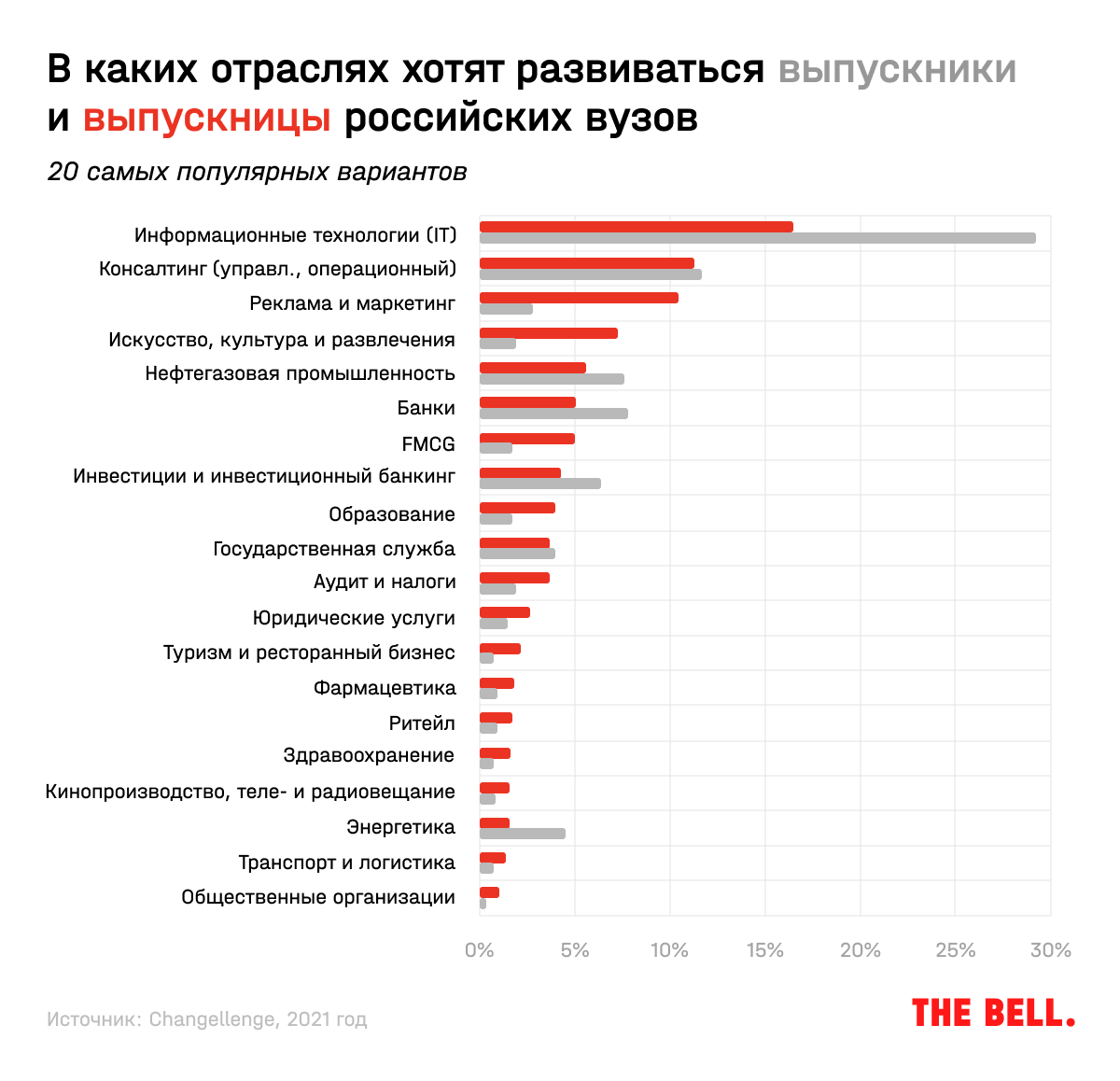 В опросе Changellenge приняли участие 5,5 тысячи студентов и выпускников, получивших диплом не более двух лет назад. Опрос проводился с октября по декабрь 2020 года. Охвачено 30 ведущих вузов, в том числе МГУ им. М.В. Ломоносова, НИУ ВШЭ, МГТУ им. Н.Э. Баумана, МФТИ, ИТМО, РЭШ.