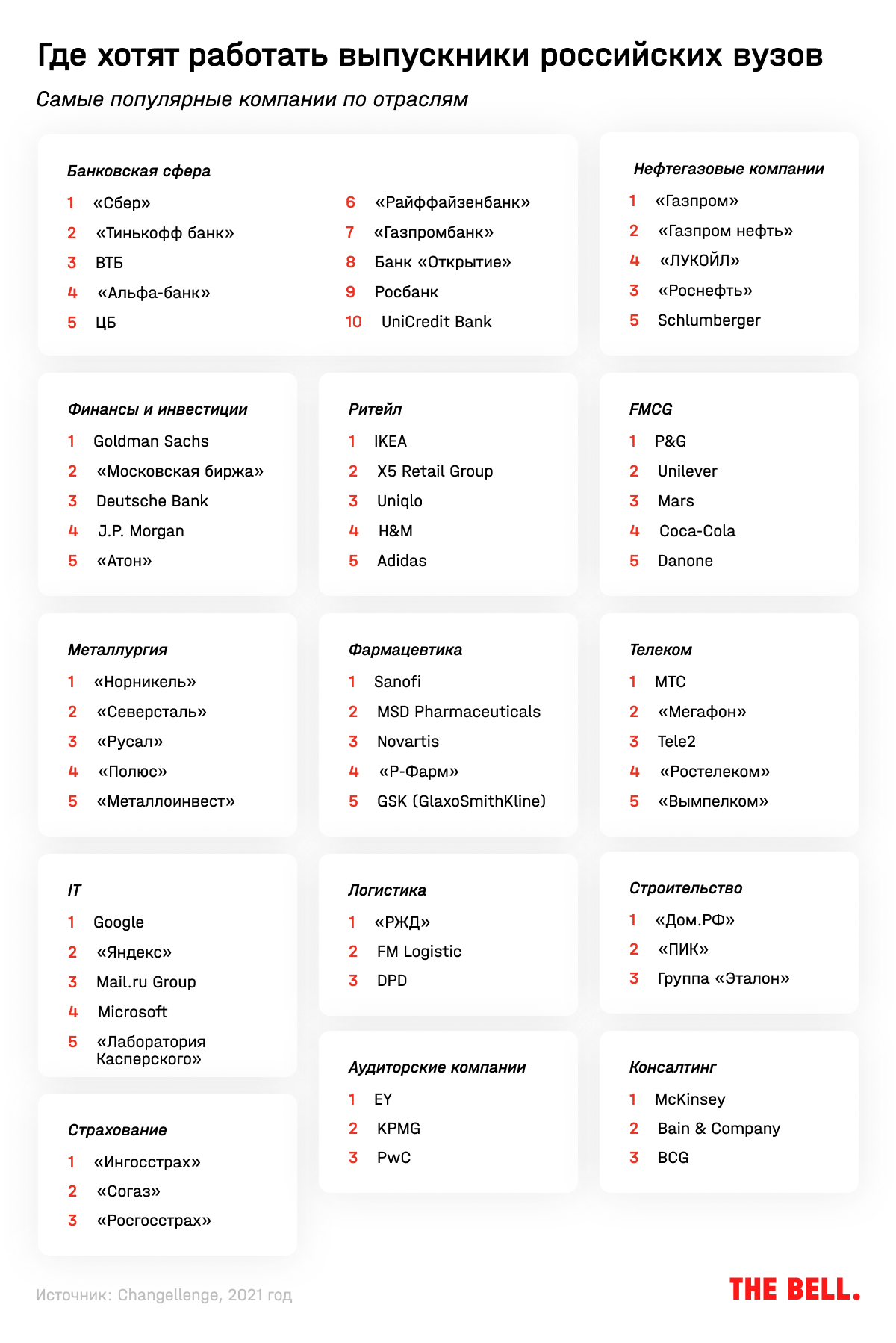 Самых популярных работодателей авторы исследования сгруппировали по отраслям.