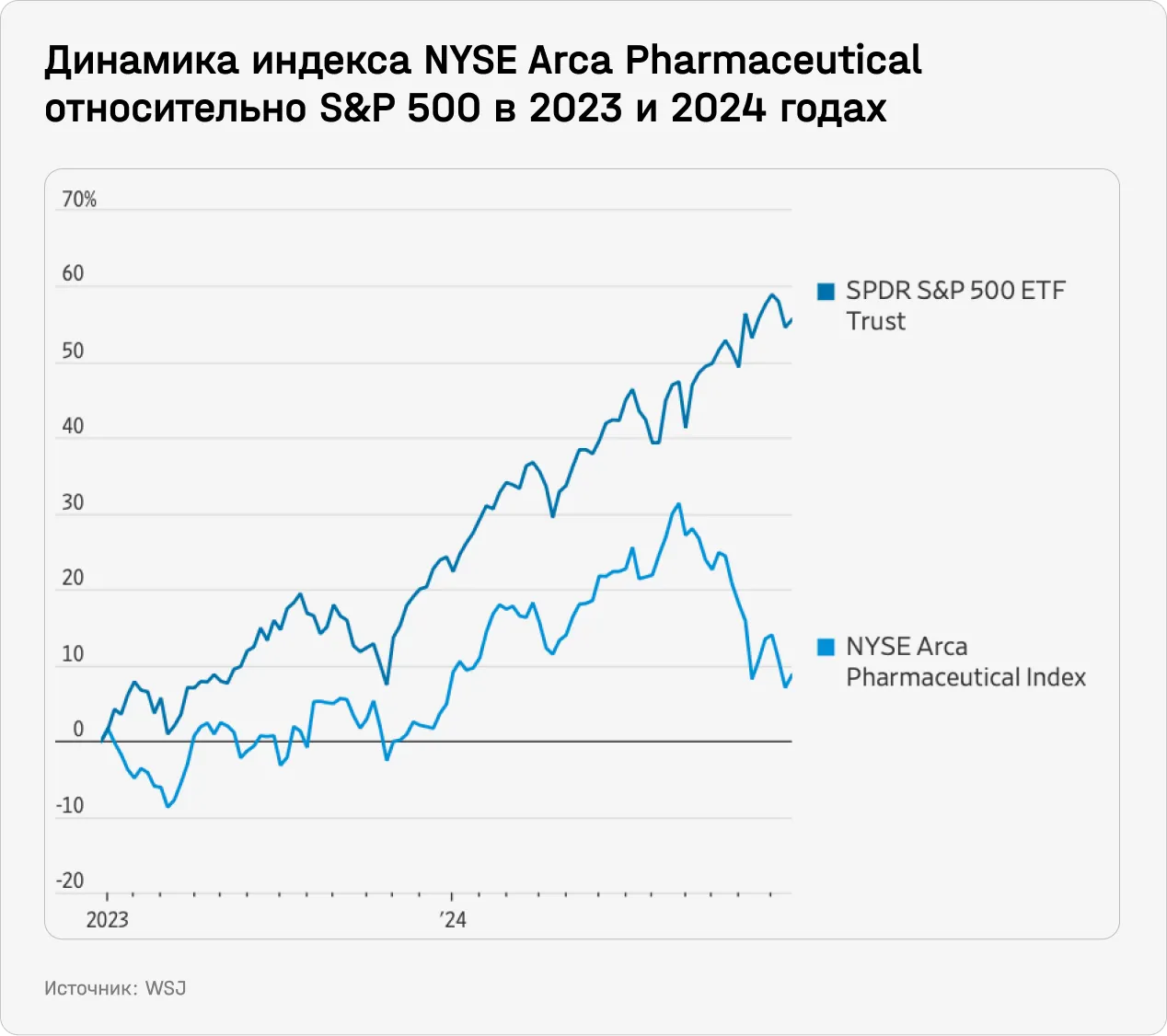 Закон «О снижении инфляции» (IRA), подписанный президентом Джо Байденом в 2022 году, расширил программу медицинского страхования в США (Medicare), позволив государству влиять на отпускную цену самых популярных лекарств. Это оказало дополнительное давление на прибыли и ударило по котировкам фармкомпаний. Распродажа только усилилась в конце 2024 года, после того как Трамп решил назначить известного скептика фармацевтической отрасли Роберта Ф. Кеннеди-младшего на пост министра здравоохранения. В результате сектор здравоохранения в 2023 и 2024 годах отстал от S&P 500 в совокупности более чем на 40 п.п.