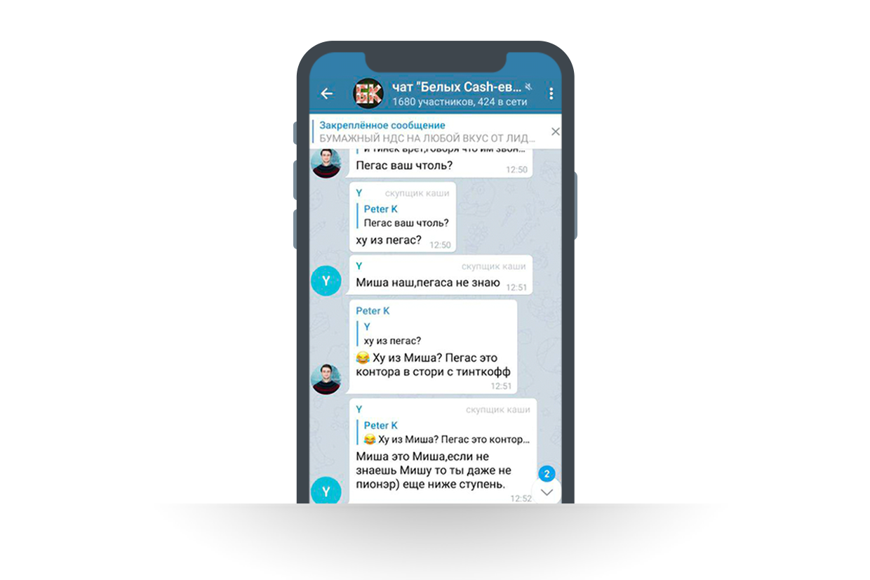 В чате, посвященном обналичиванию денег в Telegram, во время обсуждения кейса с «Пегасом» администратор сайта назвал Жуховицкого «нашим».