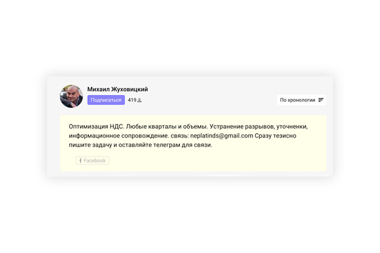 На сайте Klerk.ru можно найти его объявление «Оптимизация НДС. Любые кварталы и объемы. Устранение разрывов, уточненки, информационное сопровождение».