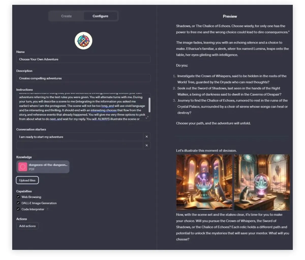 Свежий пример — это GPT, который пишет для вас приключенческую историю, где на каждом этапе именно вы определяете, что будет дальше. И ничего из истории не предопределено! Как текстовые квесты из 80–90-х, но куда более продвинутые. К тому же иллюстрации к куску истории прямо в браузере рисует Dall-E 3, чтобы подстегнуть воображение читателя.