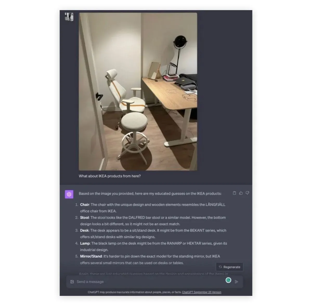 Вот пример, как GPT-4-Vision помогает провести домашнюю инвентаризацию, определив предметы из IKEA. Правда, в одном она ошиблась — внимательным читателям предлагается найти неточность! Полную историю можно прочитать здесь.
