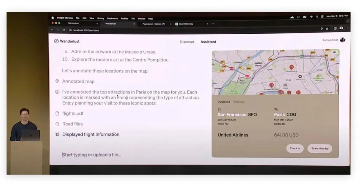 Третий компонент — действия (actions) — не был показан в рамках этого демо, но по сути это просто эволюция интерфейса подключения плагинов, про которые мы говорили в самом начале. Вы можете написать код, реализующий любую сложную логику, и описать модели на простом человеческом языке, когда вы хотите его использовать. А она, в свою очередь, уже сама будет принимать решения. Это было показано в рамках чат-бота — ассистента по путешествиям. Ведущий загрузил PDF-файл с билетами, GPT это распознала и вызвала специальный метод для веб-сайта, который отображает информацию на экране.