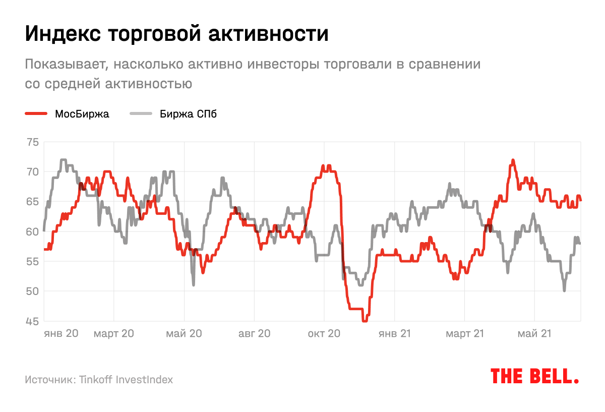 Прошлогодние взлеты и падения запомнились инвесторам надолго, но сейчас на рынке затишье. Индекс волатильности VIX находится на минимуме с начала пандемии. Разочарование инвесторов читается и в объемах торгов. Если взять российских инвесторов и их торговую активность с иностранными активами на Санкт-Петербургской бирже, то в апреле-мае объемы торгов обвалились до самых низких значений за последние полгода. Это отражает и динамика Tinkoff Investindex. Только в июне объемы торгов снова начали постепенно расти.