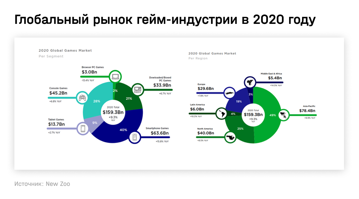 Популярности гейминга также способствовала эпидемия COVID-19: в отсутствие реальных развлечений люди разных поколений больше играют в виртуальные игры. По данным Bloomberg на июнь, за пандемию количество пользователей выросло на 35%. Исследовательская компания NewZoo прогнозирует рост продаж мирового игрового рынка на 20% по итогам 2020 года — до $175 млрд и до $256 млрд — по итогам 2025 года. Для сравнения, доходы России от экспорта нефти в успешном 2019 году составили $122 млрд.