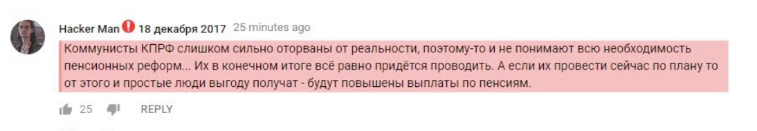- Основные тезисы комментариев троллей в Youtube совпадают с доводами правительства: реформа необходима, она позволит повысить пенсии, а людям в возрасте станет проще найти работу, во всем мире возраст выхода на пенсию выше, чем в России, а оппозиционеры и либералы разводят панику, перечисляет Смолин.