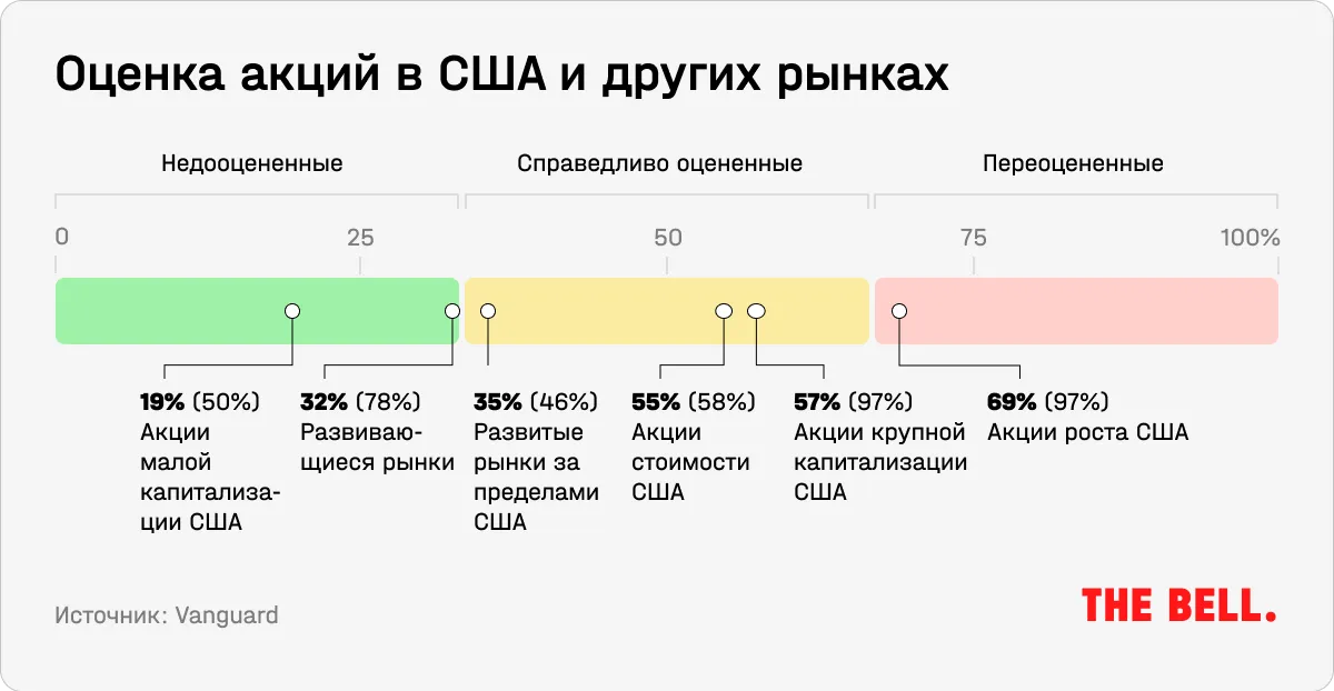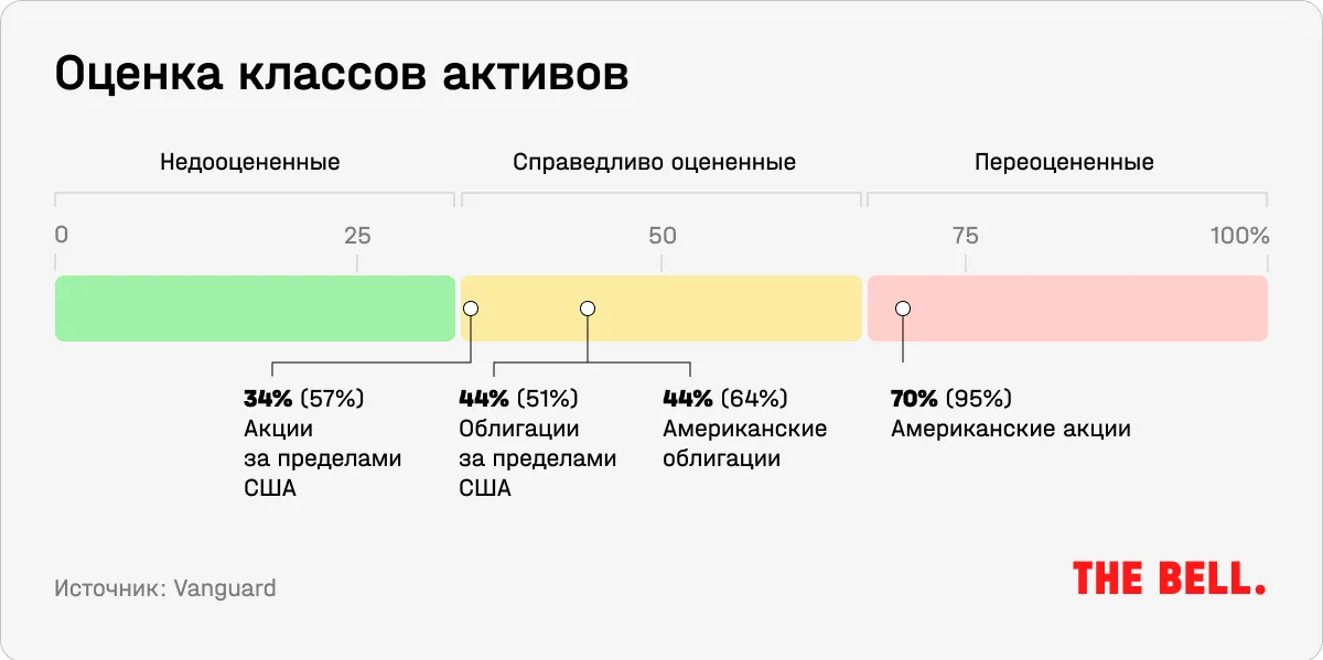 Несмотря на значительное снижение оценок акций из-за изменения ожиданий по ставкам в прошлом году, американские бумаги все еще остаются переоцененными с точки зрения ожидаемой в ближайшие 10 лет доходности. Об этом говорится в стратегии крупнейшего в мире провайдера и основоположника индексных фондов Vanguard, выпущенной в конце 2022 года. Мировые акции теперь, напротив, находятся на нижней границе справедливой оценки.