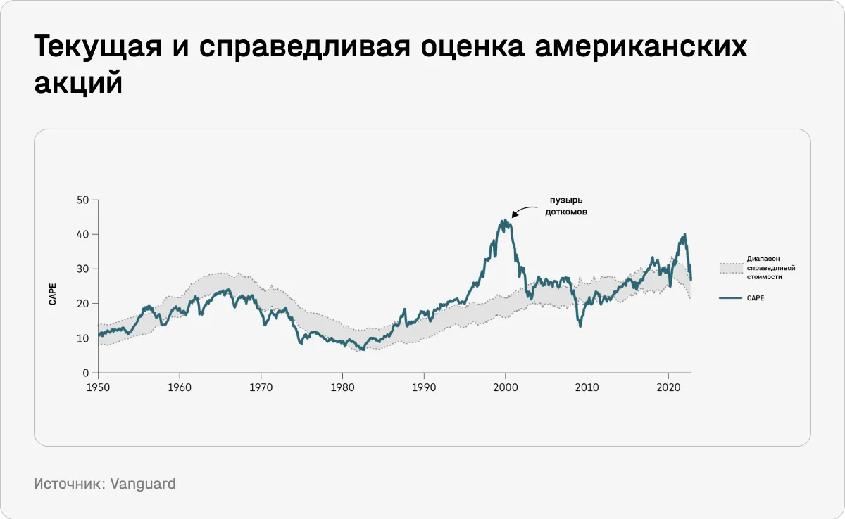 Обоснованность текущей оценки акций США аналитики Vanguard определяли как отношение текущего значения циклически скорректированного индекса Шиллера (cyclically adjusted Shiller price/earnings ratio, CAPE) к «справедливому» значению CAPE для американского рынка акций в 1940–2022 годах.