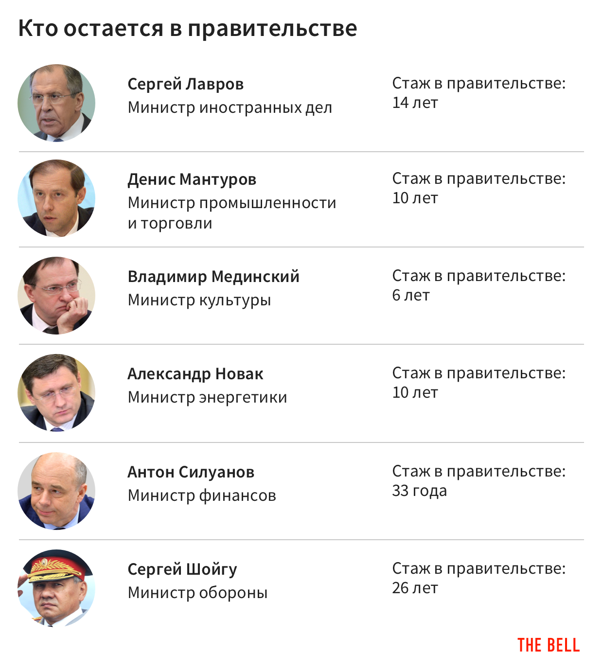 - Судьба почти всех стратегически важных министерств стала понятна уже сегодня. Сергей Лавров и Сергей Шойгу сохранят свои посты. О том, что Антон Силуанов будет совмещать посты вице-премьера и министра финансов, было известно с самого начала. Из ключевых министров не до конца понятно только будущее министра экономики Максима Орешкина — сегодня его имя не называлось ни в числе уходящих, ни в числе остающихся, но, по данным The Bell, ему предложено остаться.