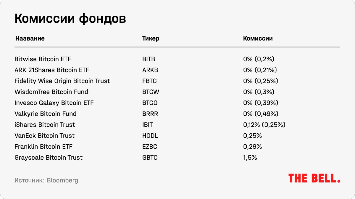 Комиссии ETF будут варьироваться в размере от 0,2% до 1,5%, при этом некоторые провайдеры, в том числе BlackRock, Ark Investment Management и Invesco, уже объявили о планах полностью отказаться от комиссий на 6–12 месяцев, чтобы привлечь инвесторов (см. график ниже). Однако фонды также зарабатывают и на спредах: анализ WSJ, проведенный днем в четверг, показал, что спреды разнятся от 2 центов у Bitwise до 58 центов у WisdomTree. C ростом объемов торгов ликвидность может вырасти, а спреды — снизиться, отмечает издание.