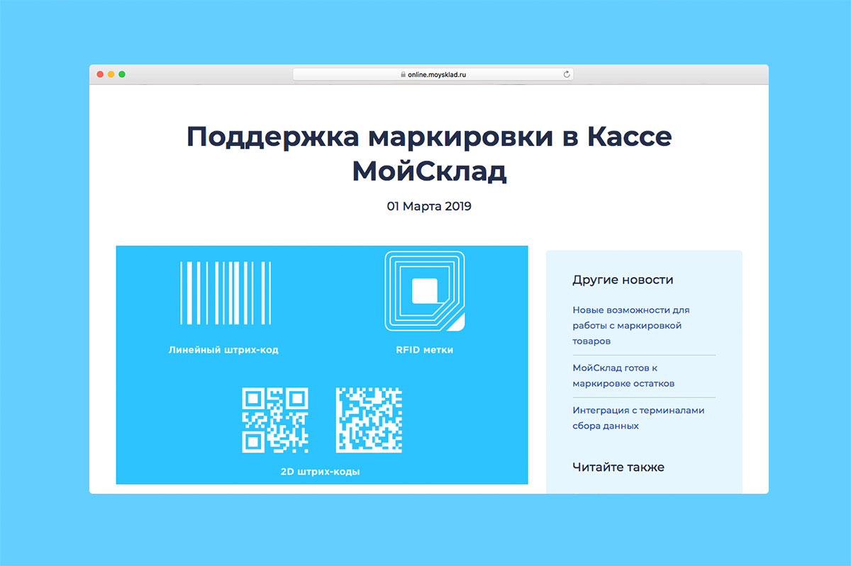 В «МоемСкладе» можно бесплатно маркировать товар: прямо из интерфейса клиенты получают коды, создают и отправляют на печать этикетки, вводят в оборот маркированную продукцию, продают ее через кассу. «МойСклад» поможет разобраться в процессе с нуля, узнать о последних изменениях от оператора маркировки и настроить работу в сервисе. Сервис предлагает бесплатные консультации, полезные статьи и вебинары.