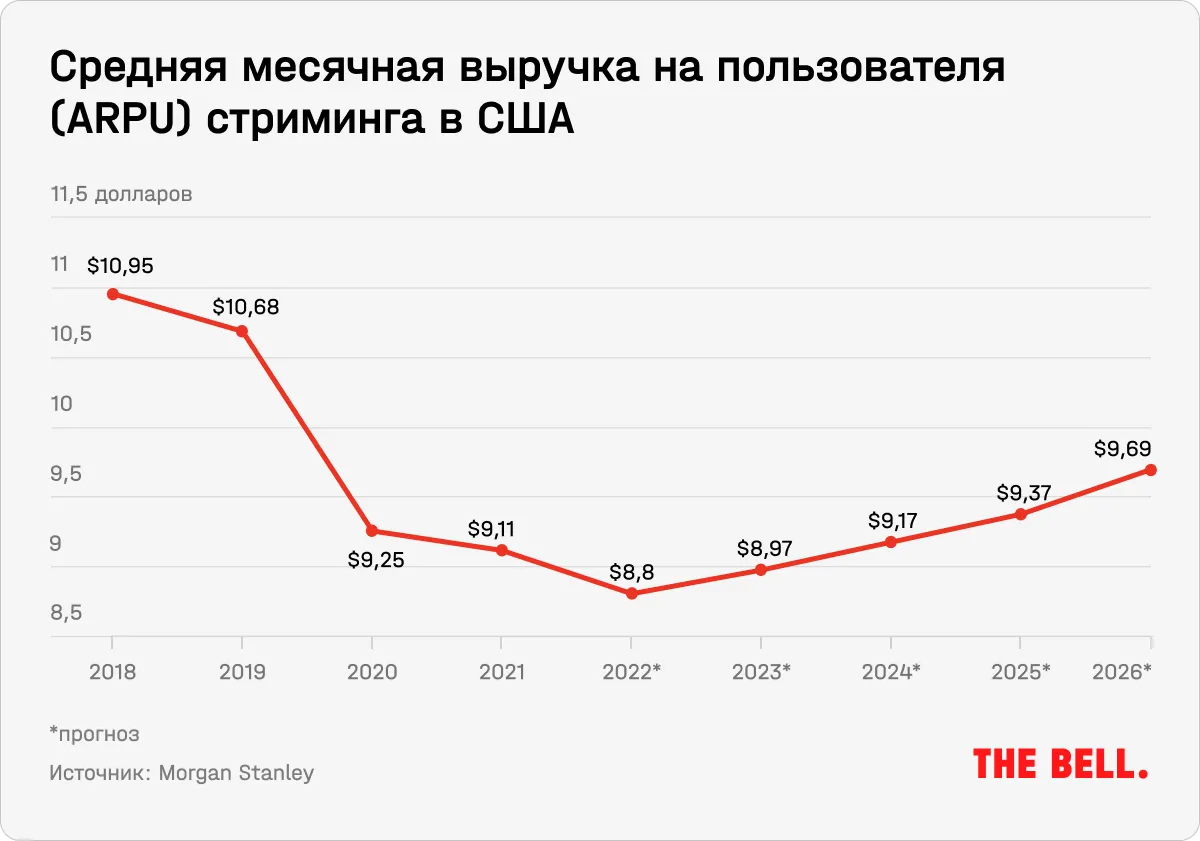 Как пример: выручка на одного пользователя в США устойчиво падает в последние годы из-за роста конкуренции. В результате ни один стриминговый сервис не имеет показателей вовлеченности, достаточных для того, чтобы эффективно переносить растущие расходы на потребителей (pricing power), говорится в отчете.