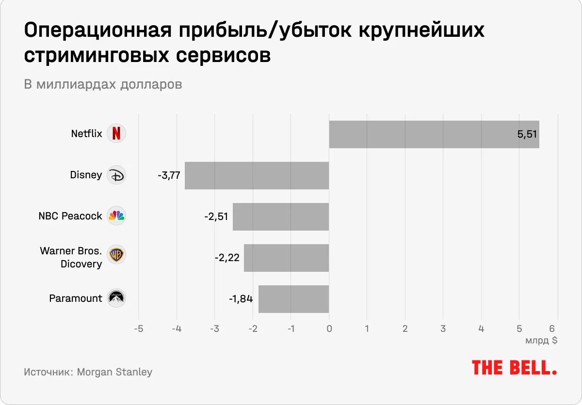 При этом «стриминговые войны» завели расходы до «неустойчивых» для компаний уровней. По прогнозу, суммарный убыток по EBIT ведущих стриминговых сервисов (за исключением лидера рынка Netflix) составит $10 млрд.