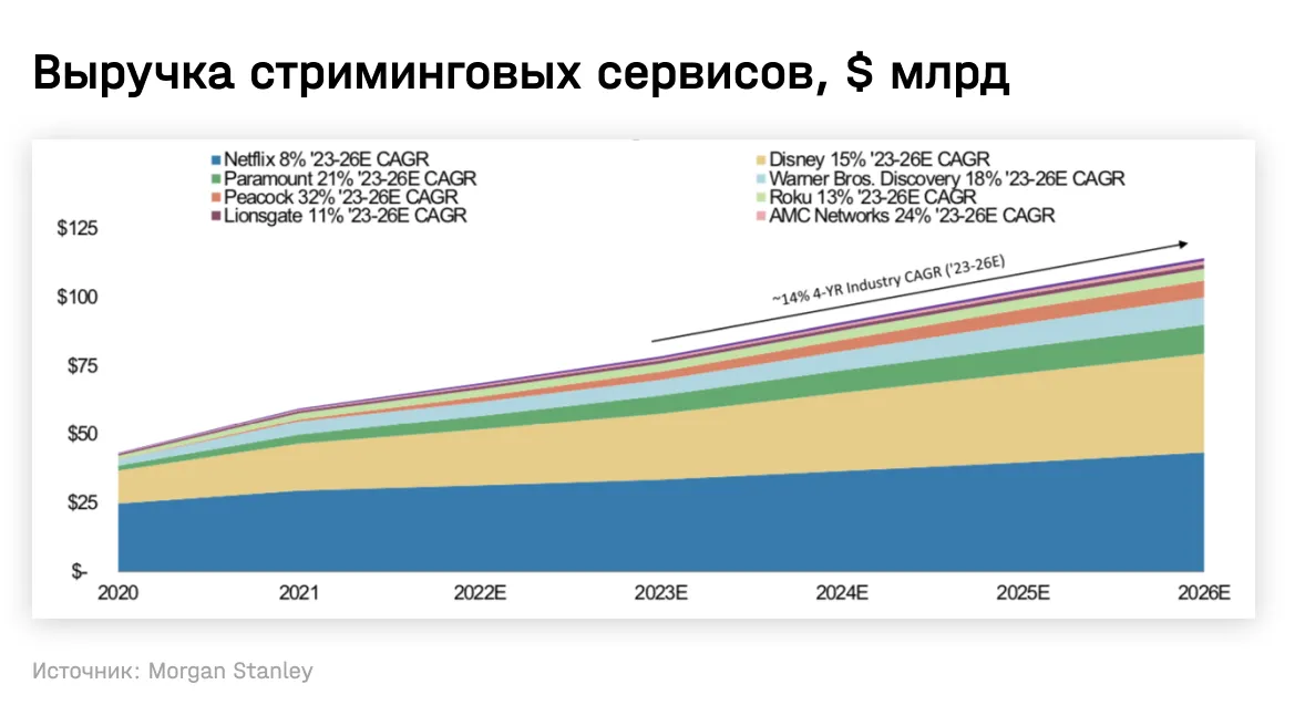 Долгосрочный взгляд на индустрию у аналитиков MS позитивный: по их прогнозу, расходы на различные подписки, предоставляющие видео, будут расти на 2% в год на горизонте до 2026 года (по сравнению с 2,4% в последние пять лет). При этом стриминговые сервисы продолжат отвоевывать аудиторию у платного ТВ: доля стриминга в общих расходах на видеоконтент по всему миру, по прогнозу, должна вырасти с текущих 25% до 35% в 2025-м. Выручка стриминговых компаний продолжит расти высокими темпами за счет внедрения рекламы и увеличения стоимости подписки.
